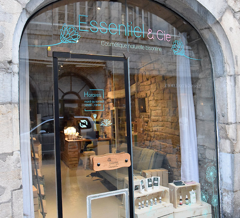 Création de l'habillage de la vitrine d'Essentiel & Cie, boutique de cosmétique naturelle à Besançon
